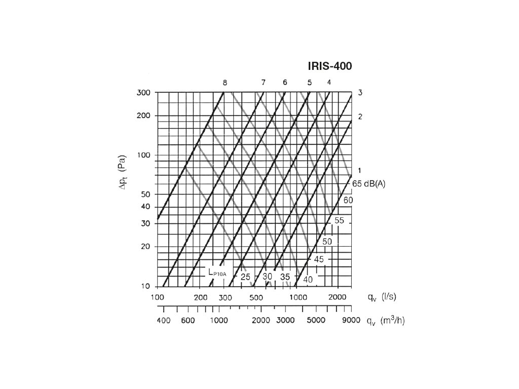Clona IRIS může být snadno použita pro měření průtoku vzduchu. Přesný ovládací mechanismus zaručuje definované rozměry otevření odpovídající měřící stupnici. Každá clona je opatřena odběry pro připojení manometru pro měření tlakové diference (pm), která se dá přímo použít k odečtení rychlosti proudění z pracovních charakteristik uvedených na cloně nebo v tištěném podkladu dodávaném s clonou. Diagramy uvedené zde v katalogu jsou určeny pro volbu vhodné velikosti clony, ne pro stanovení průtoku. Průtok vzduchu se dá snadno regulovat pomocí ovládací rukojeti (u velikostí 80–315) nebo pootočením regulační matice (u velikostí 400–800).
