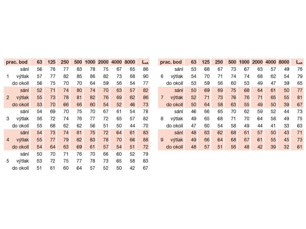 Hluk emitovaný ventilátorem je uveden v tabulkách pro čtyři části výkonové křivky.
