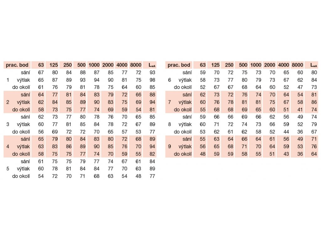 Hluk emitovaný ventilátorem je uveden v tabulkách pro čtyři části výkonové křivky.