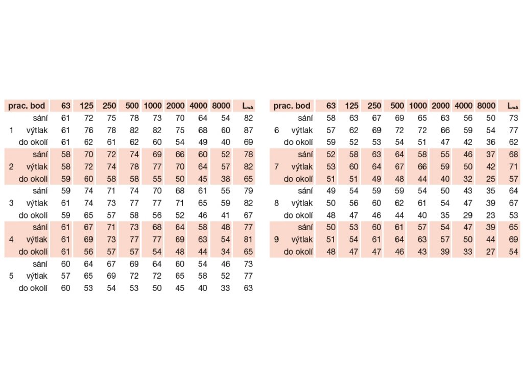 Hluk emitovaný ventilátorem je uveden v tabulkách pro čtyři části výkonové křivky.