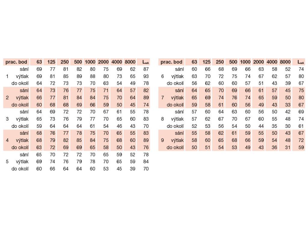 Hluk emitovaný ventilátorem je uveden v tabulkách pro čtyři části výkonové křivky.