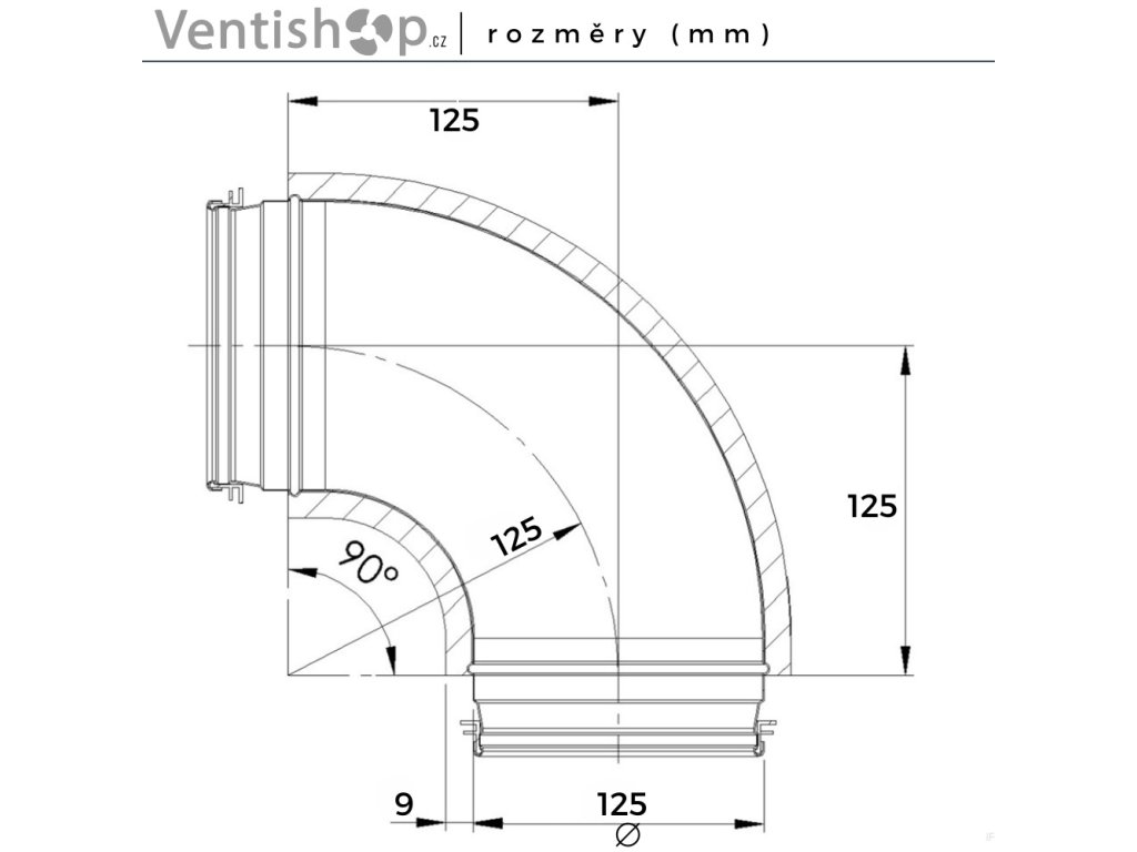 Oblouk / tvarovka - ⌀ 125 mm (průměr), úhel 90°, předizolované, EPDM těsnění, materiál pozink. ocel, materiál izolace (FEF elastomerová pěna), snadná instalace, požární bezpečnost třídy B, vzduchotěsnost třídy D, typ potrubí kruhové, provozní teplota -40 až +85 °C, tloušťka izolace 9 mm, splňuje směrnice (EN 12667, EN 13501-1), barva černá, rozměry 187 × 187 mm (Š×V), hmotnost 0,52 kg