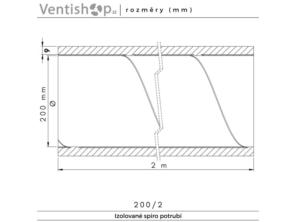 Izolované falcované potrubí / izolovaná spiro trouba - ⌀ 200 mm, délka 2 m, tloušťka 9 mm, zvuková + teplotní izolace, pozinkovaný plech, izolace (FEF) elastomerovou pěnou, pož. bezpečnost třída B, vzduchotěsnost třída D, provoz -40 °C až +85 °C, barva černá, brání vzniku kondenzátu, rozměry 2000 × 200 mm (Š × V), hmotnost 6,16 kg