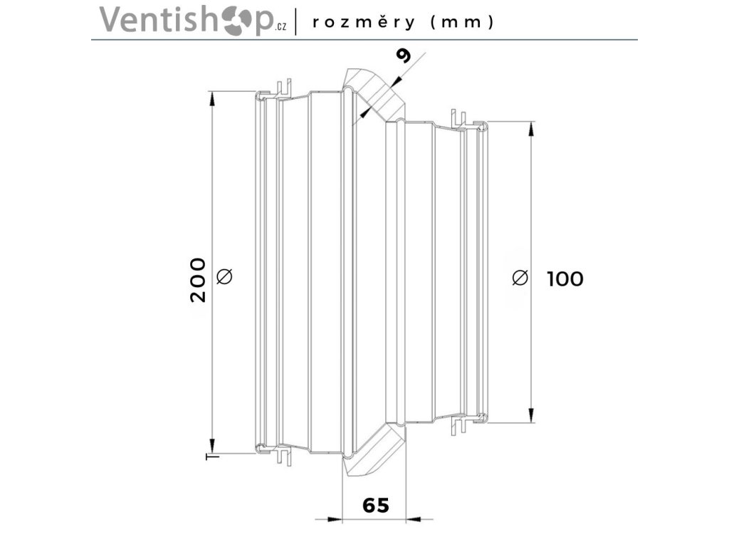 Redukce potrubí - ⌀ 100 / 200 mm (průměr), předizolované, materiál pozink. ocel, materiál izolace (FEF elastomerová pěna), snadná instalace, požární bezpečnost třídy B, vzduchotěsnost třídy D, typ potrubí kruhové, provozní teplota -40 až +85 °C, tloušťka izolace 9 mm, splňuje směrnice (EN 12667, EN 13501-1), barva černá, rozměry 195 × 200 mm (Š×V), hmotnost 0,4 kg