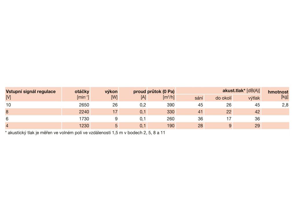 EC motor s tepelnou ochranou proti přetížení. Ložiska kuličková s tukovou náplní po dobu životnosti. Třída izolace B, krytí IP44. Pracovní teplota -20 °C až +40 °C.