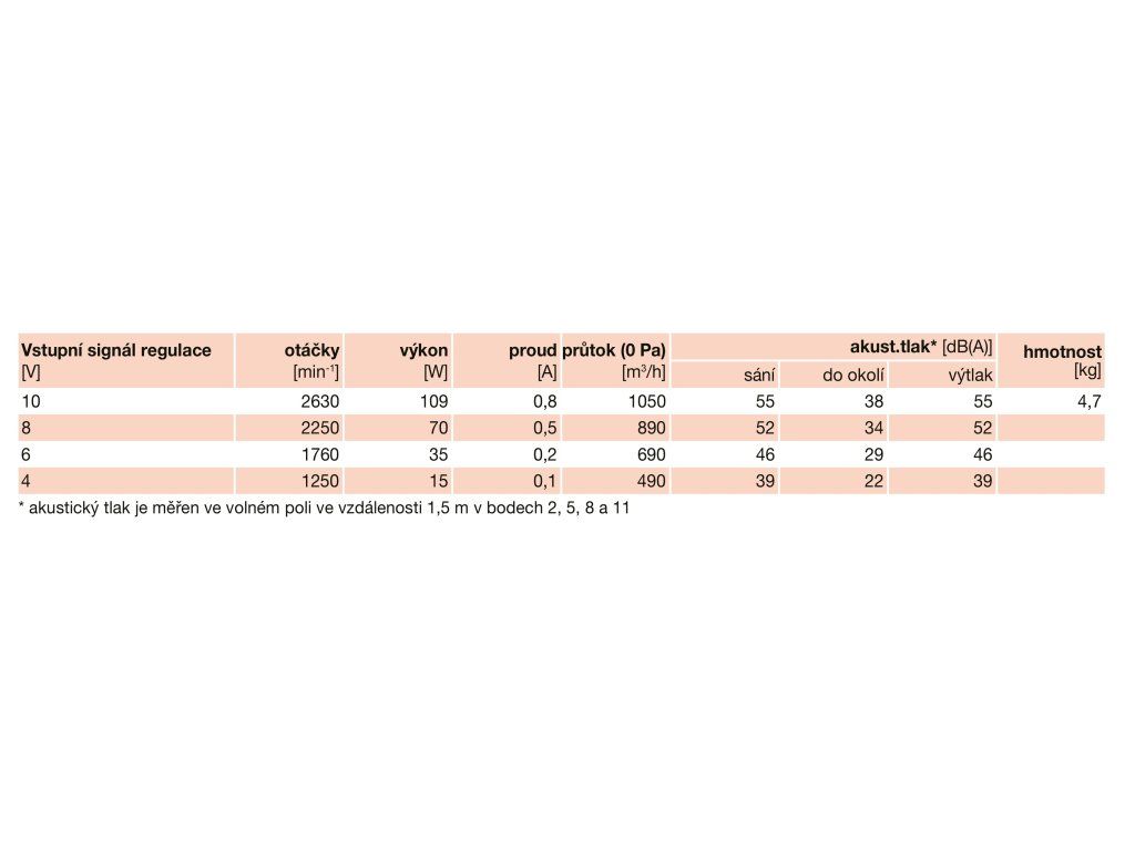 EC motor s tepelnou ochranou proti přetížení. Ložiska kuličková s tukovou náplní po dobu životnosti. Třída izolace B, krytí IP44. Pracovní teplota -20 °C až +40 °C.