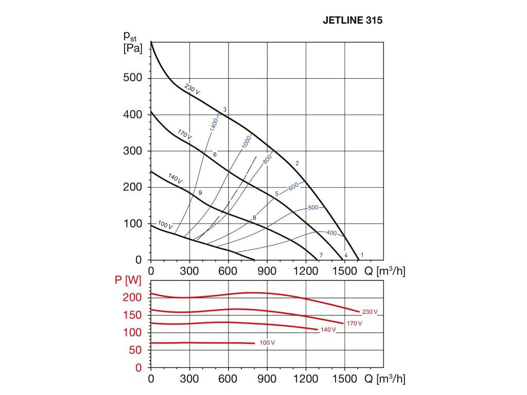 Jednofázový asynchronní motor s vnějším rotorem a tepelnou ochranou. Napětí 220-240 V, 50/60 Hz (JETLINE 315 pouze 50 Hz), Třída izolace F, krytí IP44. Pracovní teplota -20 °C až +60 °C.