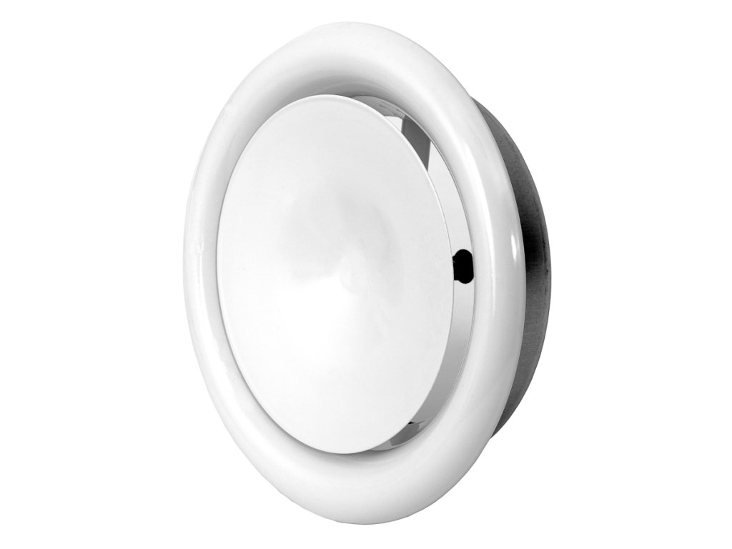 Anemostat má moderní kruhový tvar s hladkým povrchem. Vnější okraj je mírně široký a kulatý, což se příjemně podepisuje na vzhledu i funkčnosti. Středová část je kulatá a mírně vyvýšená, což umožňuje rovnoměrnou distribuci vzduchu. Na bocích jsou viditelné montážní otvory, které slouží k připevnění anemostatu k potrubí. Konstrukce je robustní, což zajišťuje dlouhou životnost a spolehlivost.