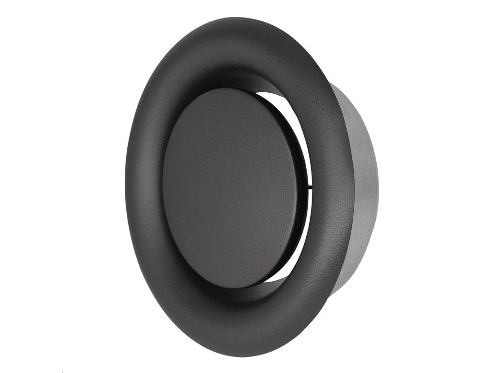 Kovový anemostat (talířový ventil, difuzor) - ⌀ 125 mm (průměr), barva černá, odvodní, ocel potažená polymerem, na stěnu / strop, kruhový, regulace průtoku, rozměry 165 × 165 mm (Š×V), hmotnost 0,3 kg