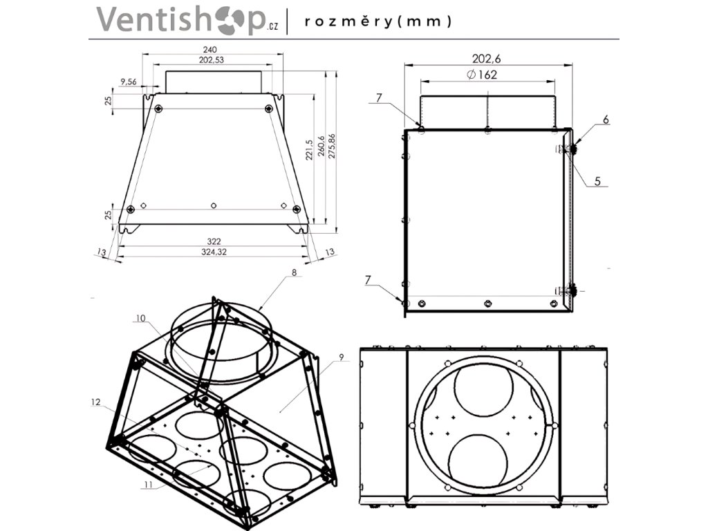 Rozdělovací / distribuční box - 6x ⌀ 90 mm + 1x ⌀ 160 mm, kvalitní zpracování, materiál pozink. ocel, materiál hrdla - plast, barva stříbrná / černá, patentově chráněná konstrukce, součástí balení (1x box, 6x těsnění, 6x trny), rozměry 324 × 275 mm (Š×V), hmotnost 2 kg