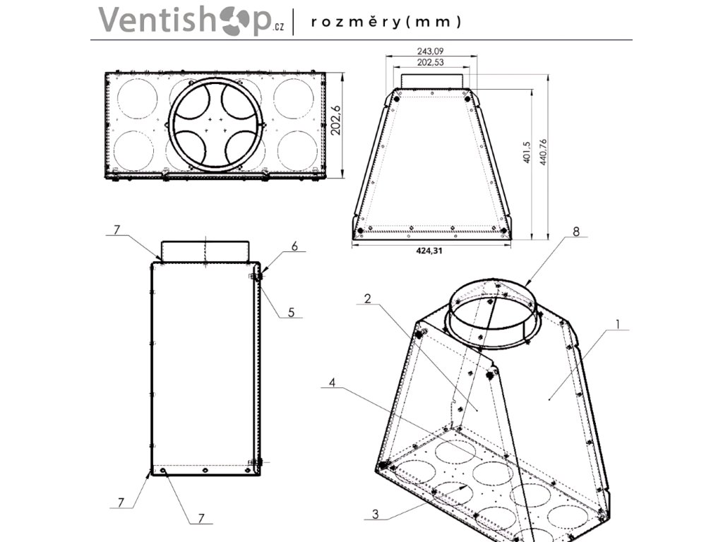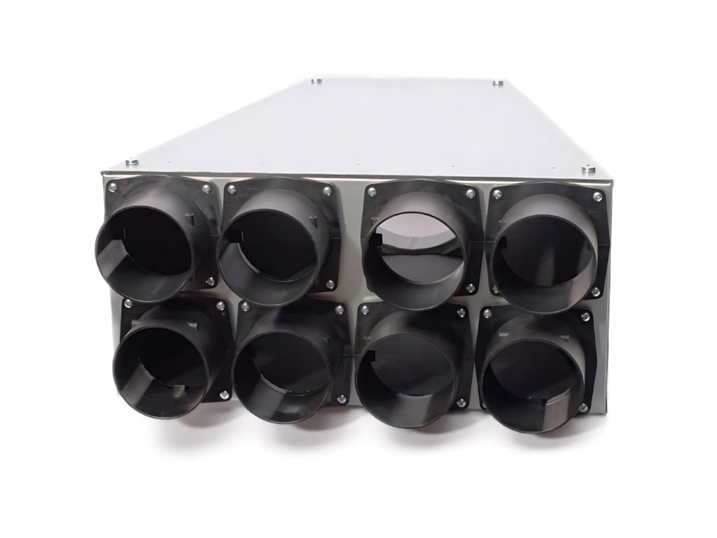 Rozdělovací / distribuční box - 8x ⌀ 90 mm + 1x ⌀ 160 mm, kvalitní zpracování, materiál pozink. ocel, materiál hrdla - plast, barva stříbrná / černá, patentově chráněná konstrukce, součástí balení (1x box, 8x těsnění, 8x trny), rozměry 424 × 440 mm (Š×V), hmotnost 2,2 kg