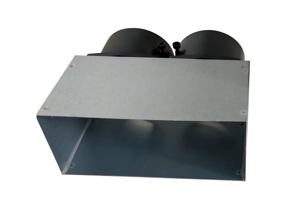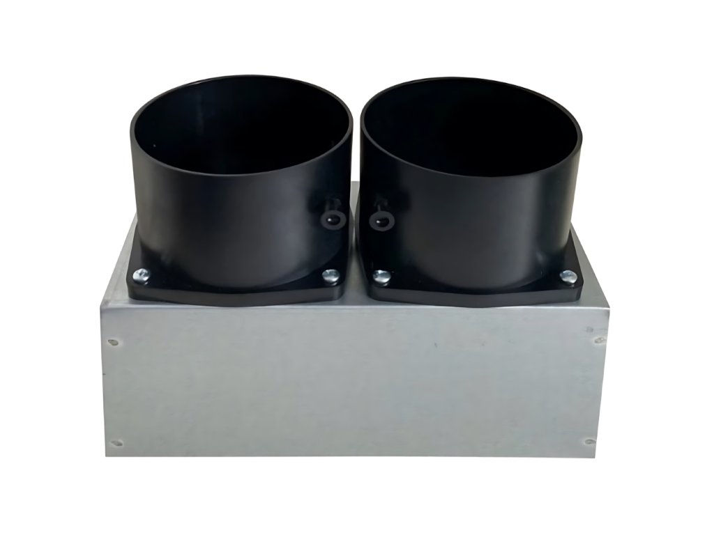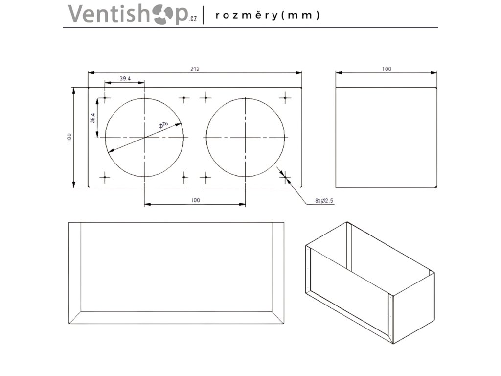 Plenum box / výustka pro větrací mřížku - ⌀ 2x 90 mm / 205 x 85 mm, konstrukce pozinkovaný plech, barva stříbrná / černá, materiál hrdla plast, prostorově nenáročné, patentově chráněná technologie, součástí balení (1x BOX, 2x těsnění, 2x trn), rozměry 212 × 100 mm (Š×V), hmotnost 0,46 kg