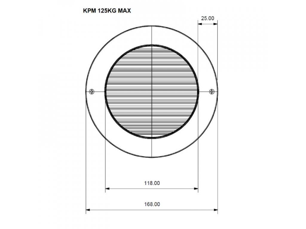 Kulatá plastová mřížka KPMb 125 MAX s okrajem 2,5 cm pro zasunutí do potrubí o průměru 125 mm.. Kulatá mřížka Max má rozšířený okraj pro zakrytí celé díry po jádrovém vrtání. Mřížky se buď šroubují nebo lepí.