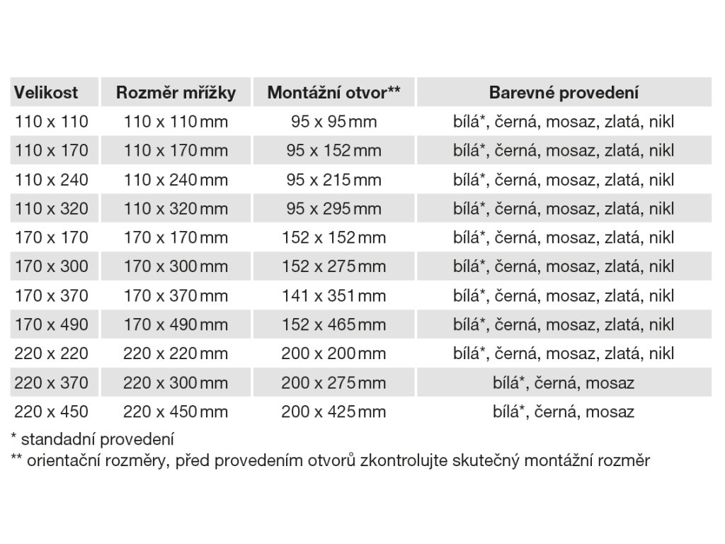pro běžné interiéry mřížky z oceli práškově lakované (v černé a mosazné metalíze a v bílé barvě)