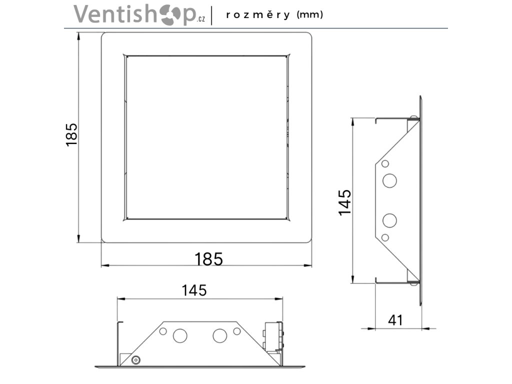 Kovová revizní dvířka tlačně otevíratelné - 145 × 145 mm (Š × V) (bez rámu), Push to open, otevírání zatlačením, odolné proti vlhkosti, polymerový nátěr, barva nerez, nerez, čtvercový tvar, předpokládané umístění (zdivo, fasáda, stěna, strop soukromých i komerčních prostor), upevnění lepidlem či šrouby, instalační otvory, rozměry (+ rám) 185 × 185 mm (Š × V), hmotnost 0,352 kg