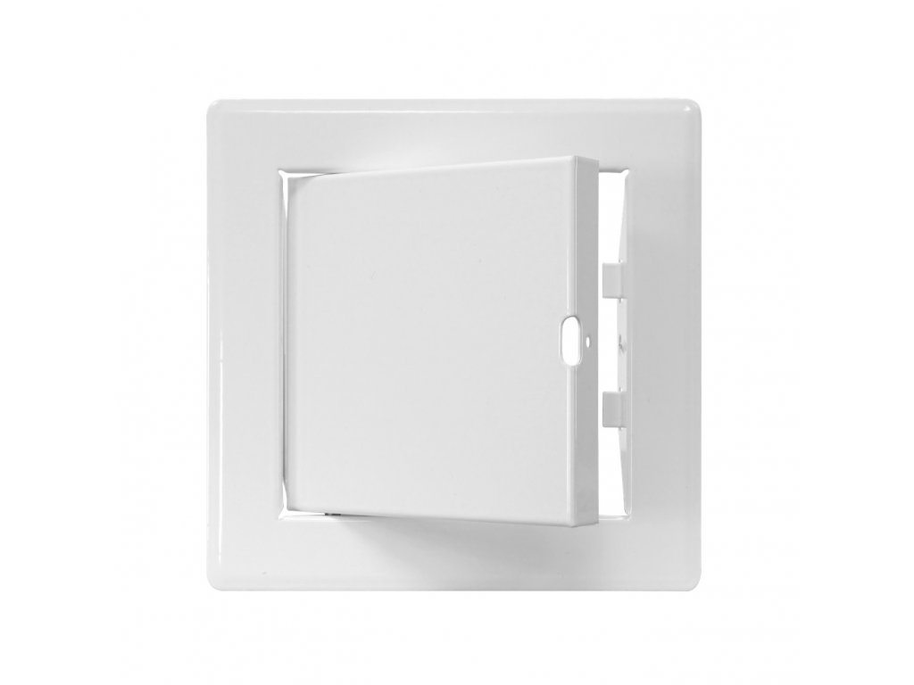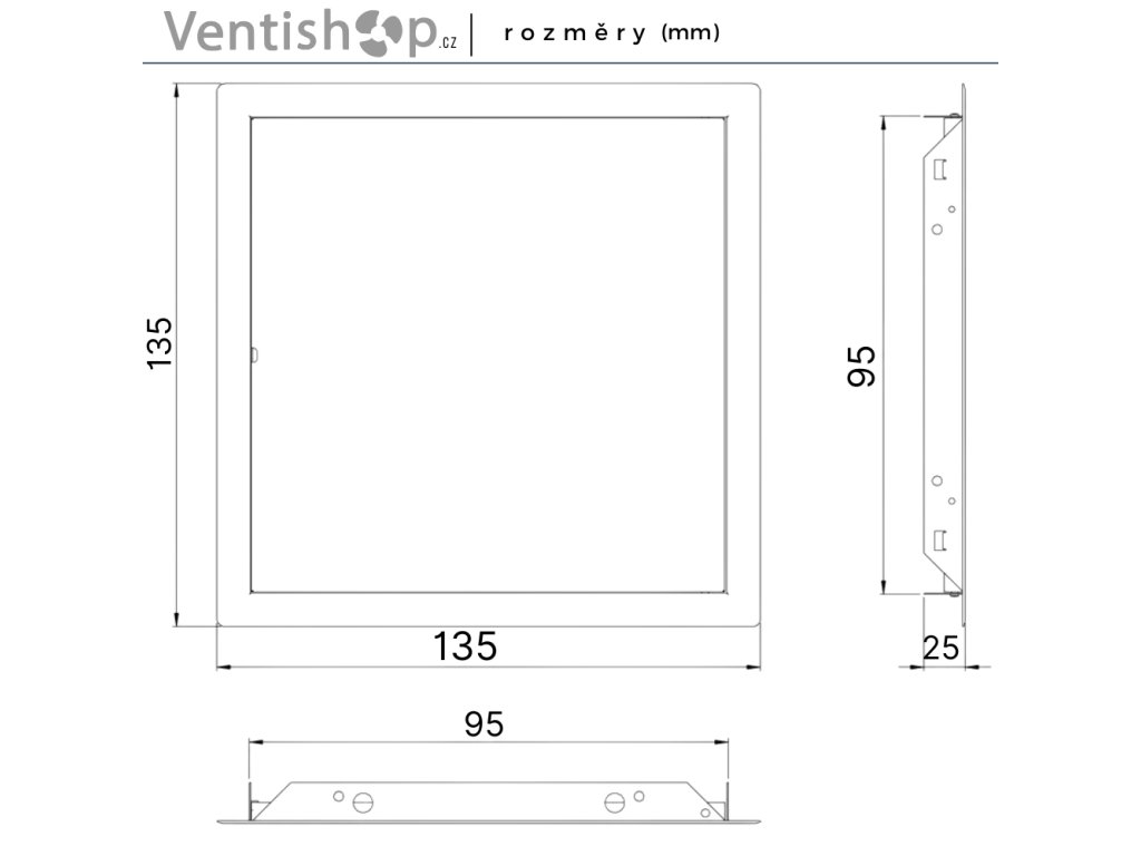Kovová revizní dvířka - 95 × 95 mm (Š × V) (bez rámu), vysoce odolné proti vlhkosti, polymerový nátěr, barva bílá, jako RAL 9016, ocel, čtvercový tvar, předpokládané umístění (zdivo, fasáda, stěna, strop soukromých i komerčních prostor), upevnění lepidlem či šrouby, instalační otvory, rozměry (+ rám) 135 × 135 mm (Š × V), hmotnost 0,163 kg