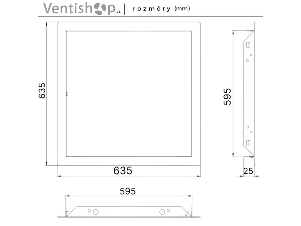 Kovová revizní dvířka - 595 × 595 mm (Š × V) (bez rámu), vysoce odolné proti vlhkosti, polymerový nátěr, barva bílá, jako RAL 9016, ocel, čtvercový tvar, předpokládané umístění (zdivo, fasáda, stěna, strop soukromých i komerčních prostor), upevnění lepidlem či šrouby, instalační otvory, rozměry (+ rám) 635 × 635 mm (Š × V), hmotnost 2,78 kg