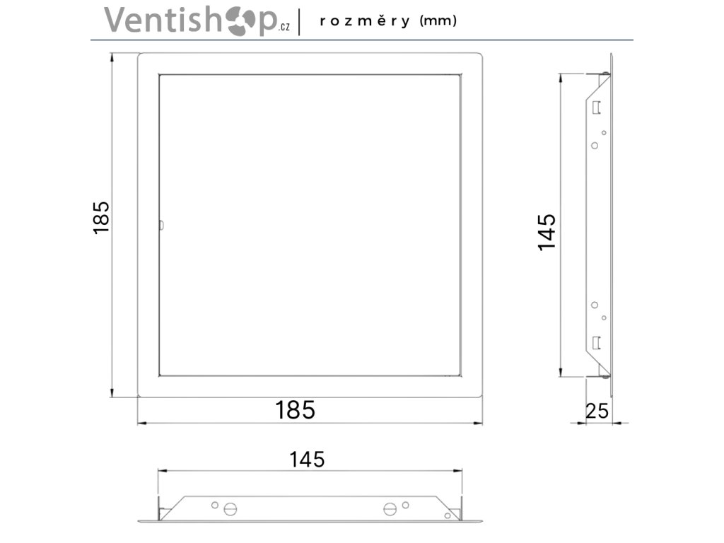 Kovová revizní dvířka - 145 × 145 mm (Š × V) (bez rámu), vysoce odolné proti vlhkosti, polymerový nátěr, barva antracitově černá, ocel, čtvercový tvar, předpokládané umístění (zdivo, fasáda, stěna, strop soukromých i komerčních prostor), upevnění lepidlem či šrouby, instalační otvory, rozměry (+ rám) 185 × 185 mm (Š × V), hmotnost 0,298 kg