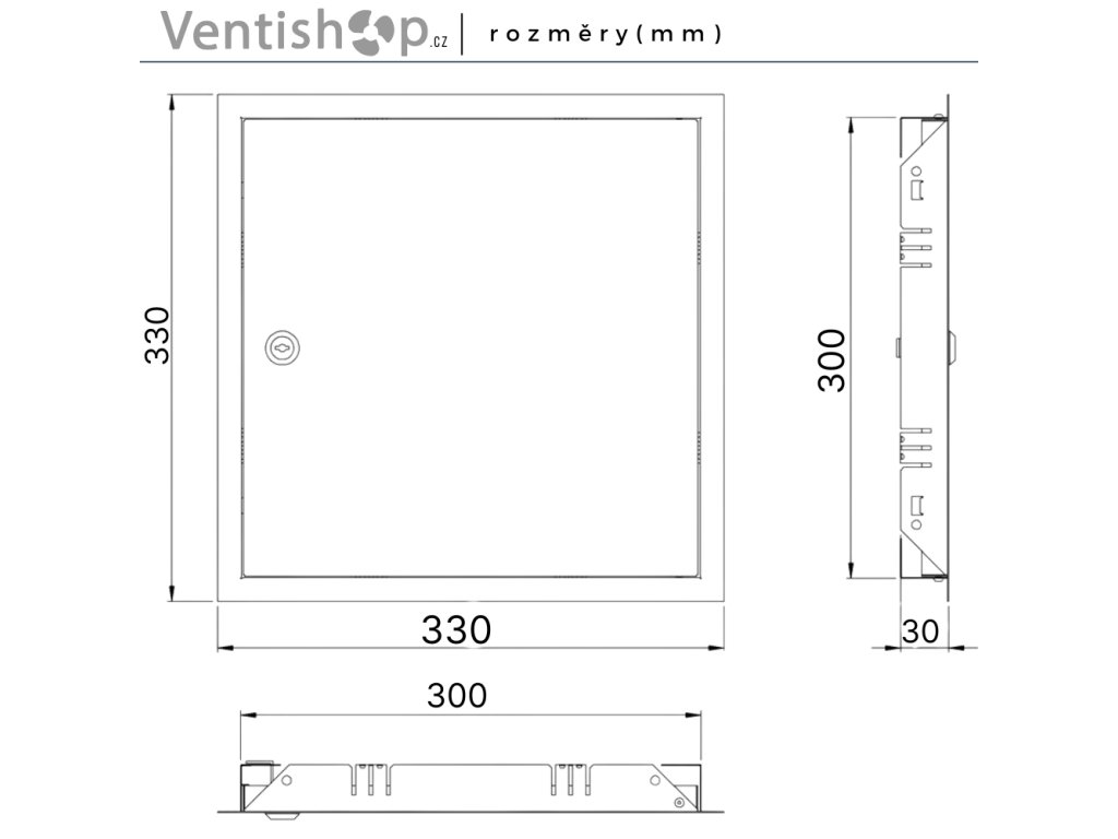 Kovová revizní dvířka - 300 × 300 mm (Š × V) (bez rámu), se zámkem, odolné proti vlhkosti, hranaté rámečky, polymerový nátěr, barva bílá, jako RAL 9016, pozink. ocel, čtvercový tvar, předpokládané umístění (zdivo, fasáda, stěna, strop soukromých i komerčních prostor), upevnění lepidlem či šrouby, instalační otvory, s úchyty pro sádrokarton, rozměry (+ rám) 330 × 330 mm (Š × V), hmotnost 0,96 kg