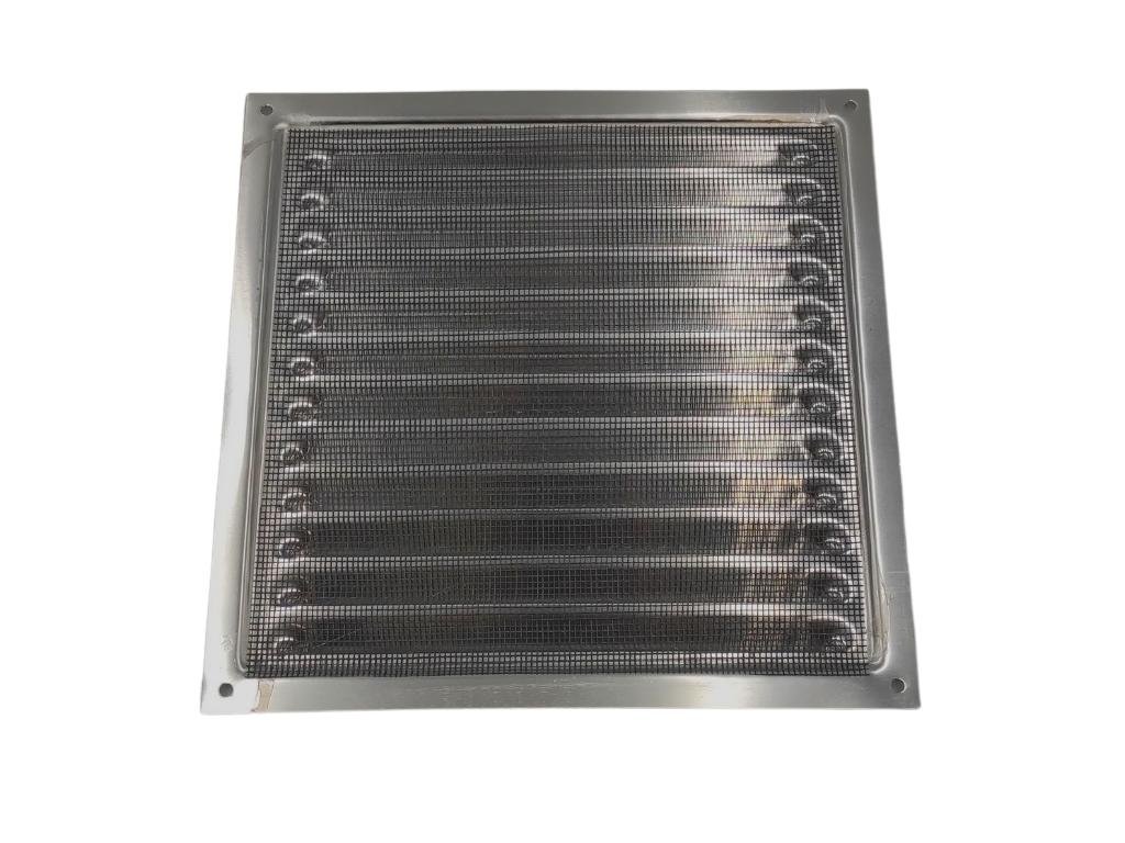 Hliníková větrací mřížka se síťkou KVMa300 s vnějším rozměrem 300x300 mm. Ventilační mřížka s pevnými skloněnými horizontálními žaluziemi je vhodná k větrání bytů či komerčních objektů jako jsou obchody, koupelny, šatny, kanceláře, WC, haly, prodejny, sklady, garáže apod.