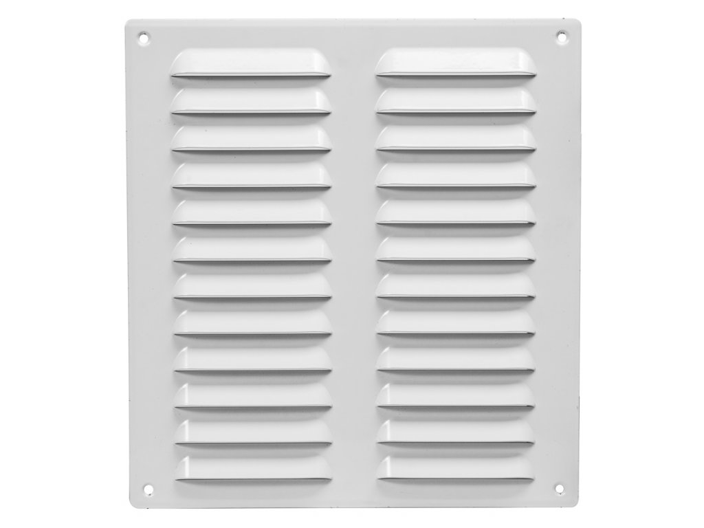Ventilační mřížka - bez příruby, barva bílá, materiál pozink. ocel, s pevnou protidešťovou žaluzií, obdélníkový tvar, předpokládané umístění (fasáda, zdivo), elegantní design, síť proti hmyzu, ptactvu, hlodavcům, jednoduchá instalace, montážní otvory, rozměry 260 × 280 mm (Š×V), hmotnost 0,4 kg