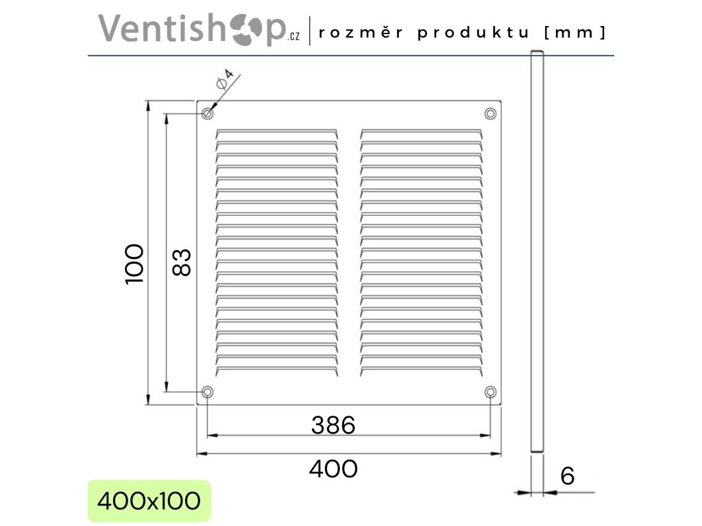 Ventilační mřížka - bez příruby, barva béžová, materiál pozink. ocel, obdélníkový tvar, předpokládané umístění (fasáda, zdivo), elegantní design, síť proti hmyzu, ptactvu, hlodavcům, jednoduchá instalace, montážní otvory, rozměry 400 × 100 mm (Š×V), hmotnost 0,2 kg