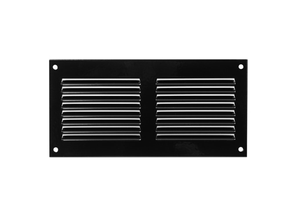 Ventilační mřížka - bez příruby, barva černá, materiál pozink. ocel, obdélníkový tvar, předpokládané umístění (fasáda, zdivo), elegantní design, síť proti hmyzu, ptactvu, hlodavcům, jednoduchá instalace, montážní otvory, rozměry 200 × 100 mm (Š×V), hmotnost 0,1 kg