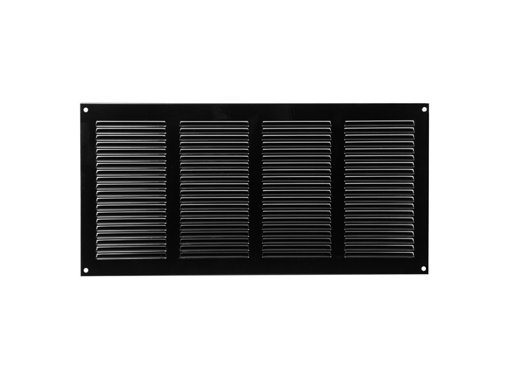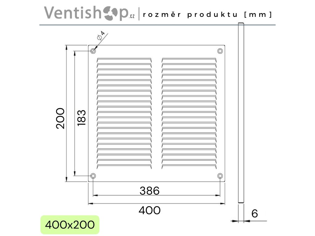 Ventilační mřížka - bez příruby, barva černá, materiál pozink. ocel, obdélníkový tvar, předpokládané umístění (fasáda, zdivo), elegantní design, síť proti hmyzu, ptactvu, hlodavcům, jednoduchá instalace, montážní otvory, rozměry 400 × 200 mm (Š×V), hmotnost 0,4 kg