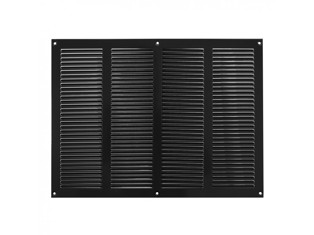 Ventilační mřížka - bez příruby, barva černá, materiál pozink. ocel, obdélníkový tvar, předpokládané umístění (fasáda, zdivo), elegantní design, síť proti hmyzu, ptactvu, hlodavcům, jednoduchá instalace, montážní otvory, rozměry 400 × 300 mm (Š×V), hmotnost 0,5 kg