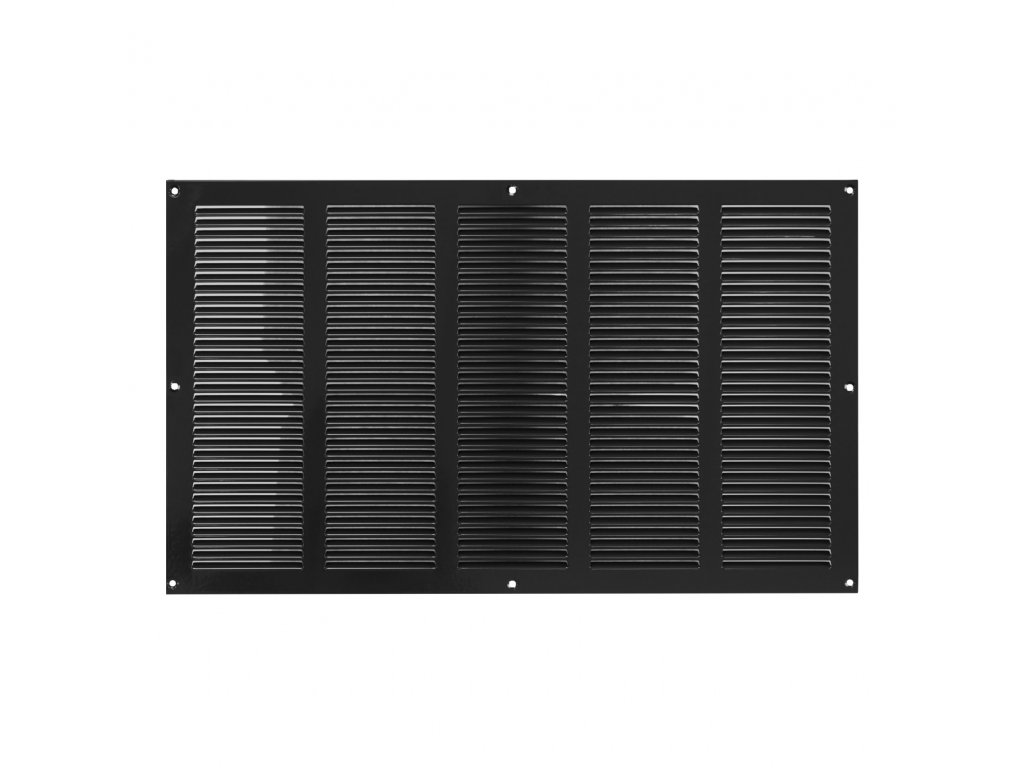 Ventilační mřížka - bez příruby, barva černá, materiál pozink. ocel, obdélníkový tvar, předpokládané umístění (fasáda, zdivo), elegantní design, síť proti hmyzu, ptactvu, hlodavcům, jednoduchá instalace, montážní otvory, rozměry 500 × 300 mm (Š×V), hmotnost 0,6 kg