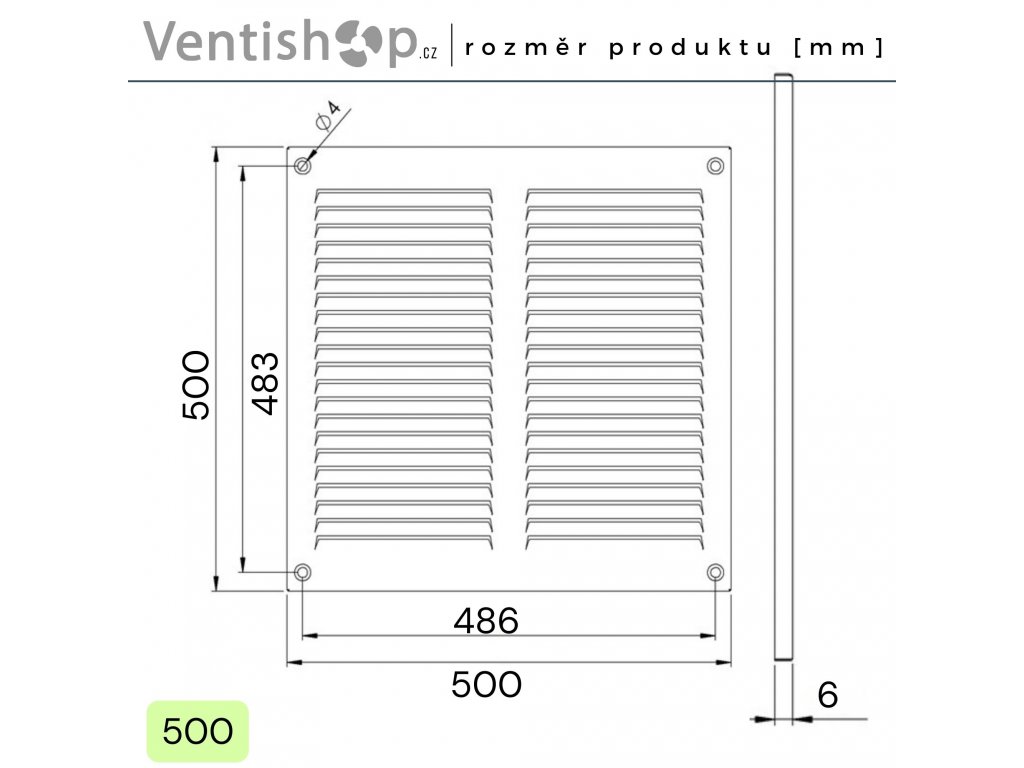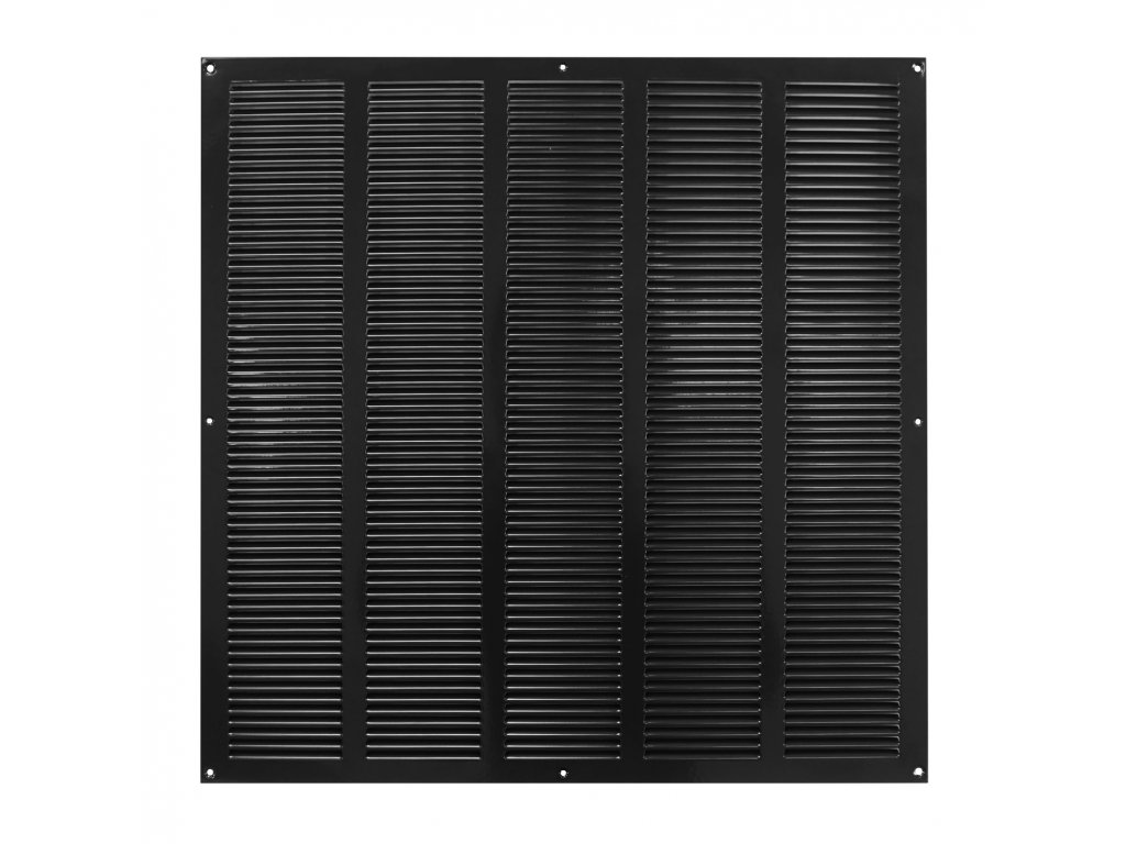 Ventilační mřížka - bez příruby, barva černá, materiál pozink. ocel, čtvercový tvar, předpokládané umístění (fasáda, zdivo), elegantní design, síť proti hmyzu, ptactvu, hlodavcům, jednoduchá instalace, montážní otvory, rozměry 500 × 500 mm (Š×V), hmotnost 0,9 kg