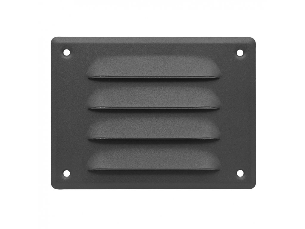 Ventilační mřížka - bez příruby, barva antracitově černá, materiál pozink. ocel, s pevnou protidešťovou žaluzií, obdélníkový tvar, předpokládané umístění (fasáda, zdivo), elegantní design, síť proti hmyzu, ptactvu, hlodavcům, jednoduchá instalace, montážní otvory, rozměry 140 × 105 mm (Š×V), hmotnost 0,1 kg