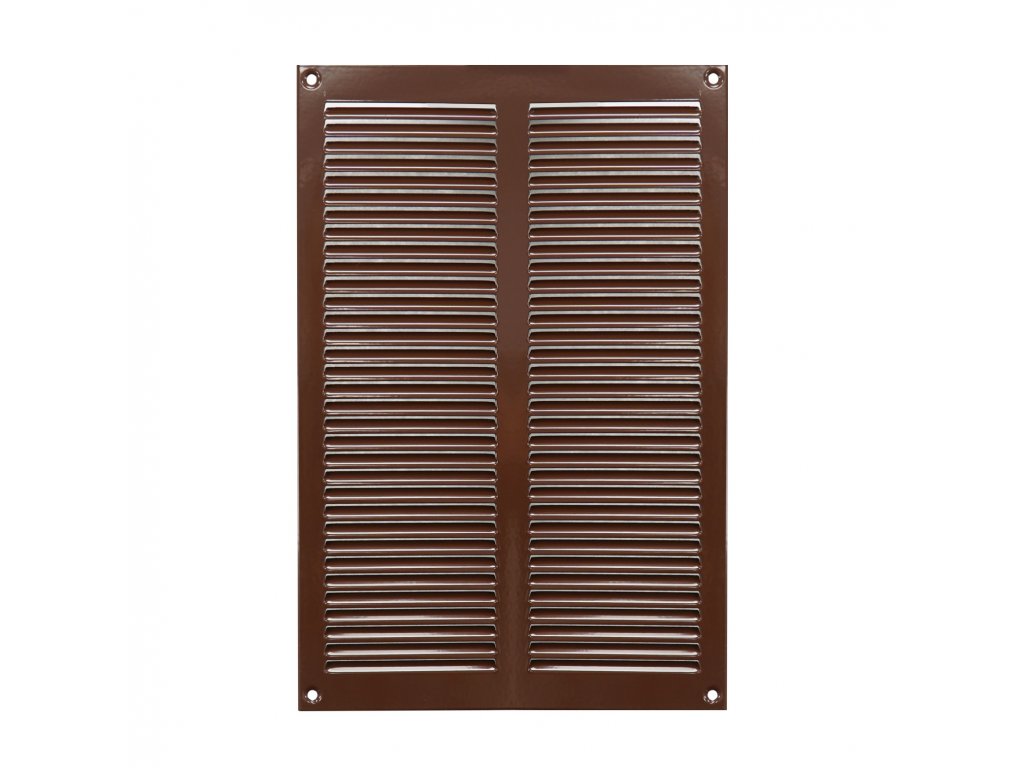 Ventilační mřížka - bez příruby, barva hnědá, materiál pozink. ocel, obdélníkový tvar, předpokládané umístění (fasáda, zdivo), elegantní design, síť proti hmyzu, ptactvu, hlodavcům, jednoduchá instalace, montážní otvory, rozměry 200 × 300 mm (Š×V), hmotnost 0,2 kg
