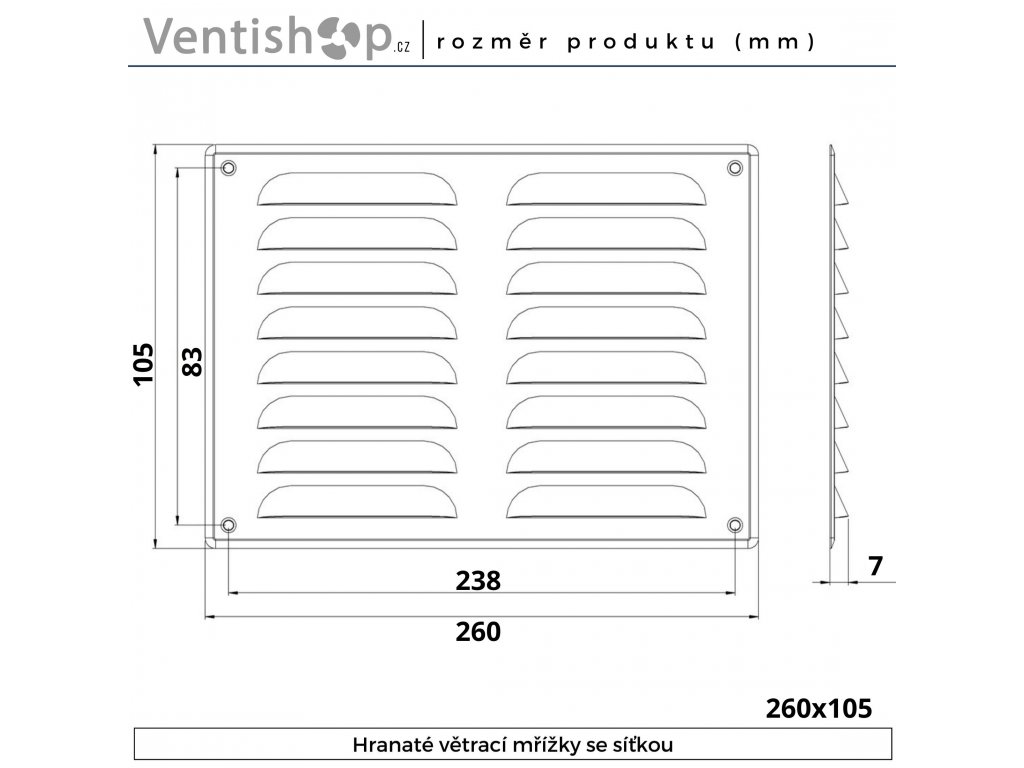Ventilační mřížka - bez příruby, barva hnědá, materiál pozink. ocel, s pevnou protidešťovou žaluzií, obdélníkový tvar, předpokládané umístění (fasáda, zdivo), elegantní design, síť proti hmyzu, ptactvu, hlodavcům, jednoduchá instalace, montážní otvory, rozměry 260 × 105 mm (Š×V), hmotnost 0,2 kg