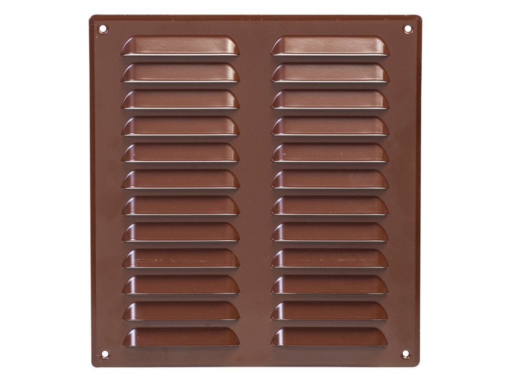 Ventilační mřížka - bez příruby, barva hnědá, materiál pozink. ocel, s pevnou protidešťovou žaluzií, obdélníkový tvar, předpokládané umístění (fasáda, zdivo), elegantní design, síť proti hmyzu, ptactvu, hlodavcům, jednoduchá instalace, montážní otvory, rozměry 260 × 280 mm (Š×V), hmotnost 0,4 kg