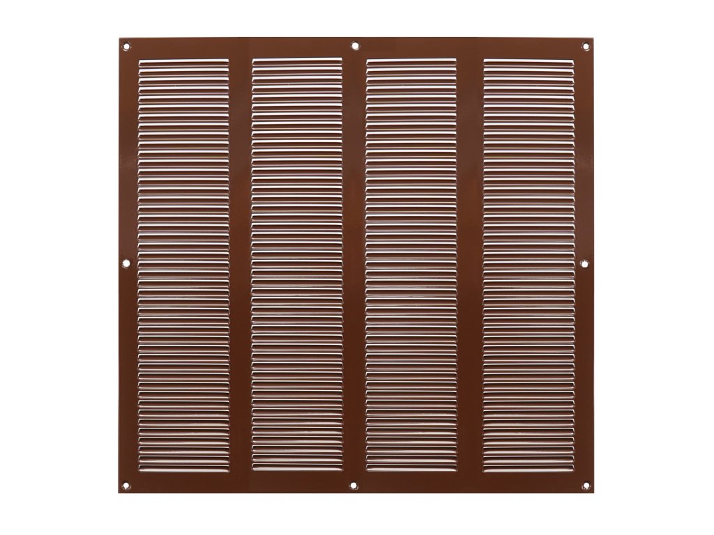 Ventilační mřížka - bez příruby, barva hnědá, materiál pozink. ocel, čtvercový tvar, předpokládané umístění (fasáda, zdivo), elegantní design, síť proti hmyzu, ptactvu, hlodavcům, jednoduchá instalace, montážní otvory, rozměry 400 × 400 mm (Š×V), hmotnost 0,7 kg