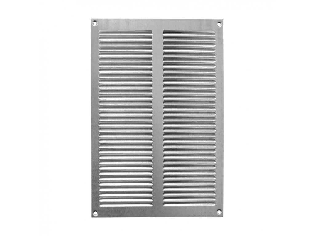 Ventilační mřížka - bez příruby, barva šedá / stříbrná (bez nátěru), materiál pozink. ocel, obdélníkový tvar, předpokládané umístění (fasáda, zdivo), elegantní design, síť proti hmyzu, ptactvu, hlodavcům, jednoduchá instalace, montážní otvory, rozměry 200 × 300 mm (Š×V), hmotnost 0,2 kg