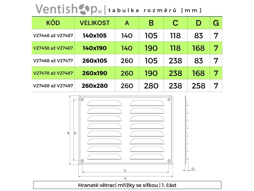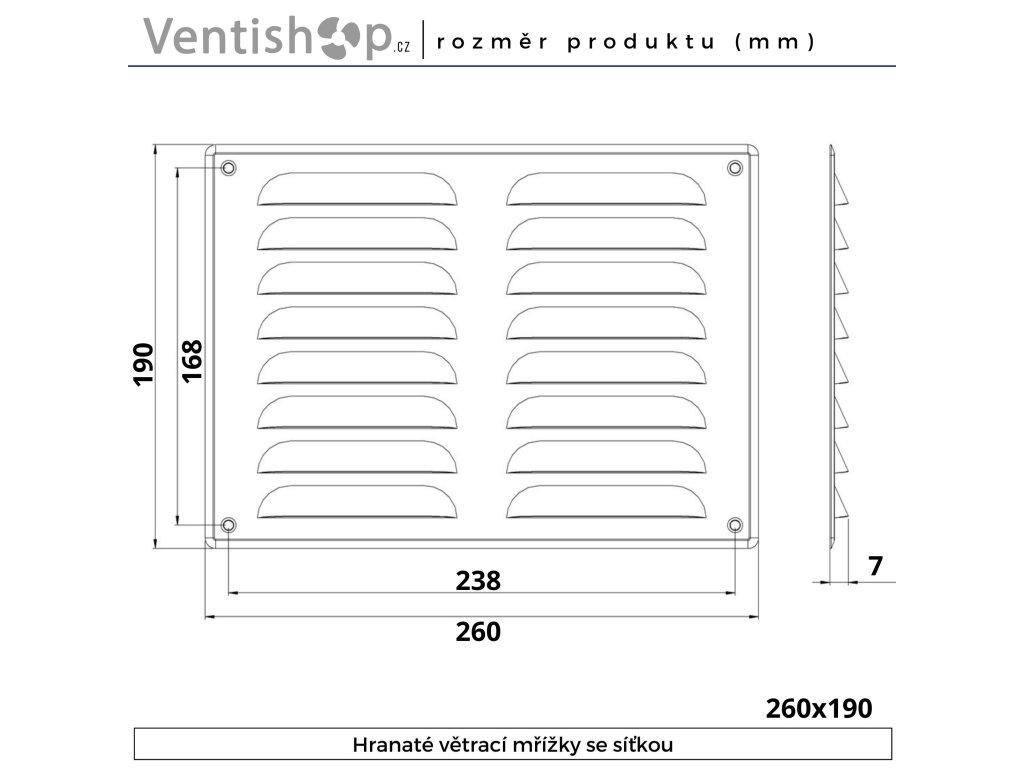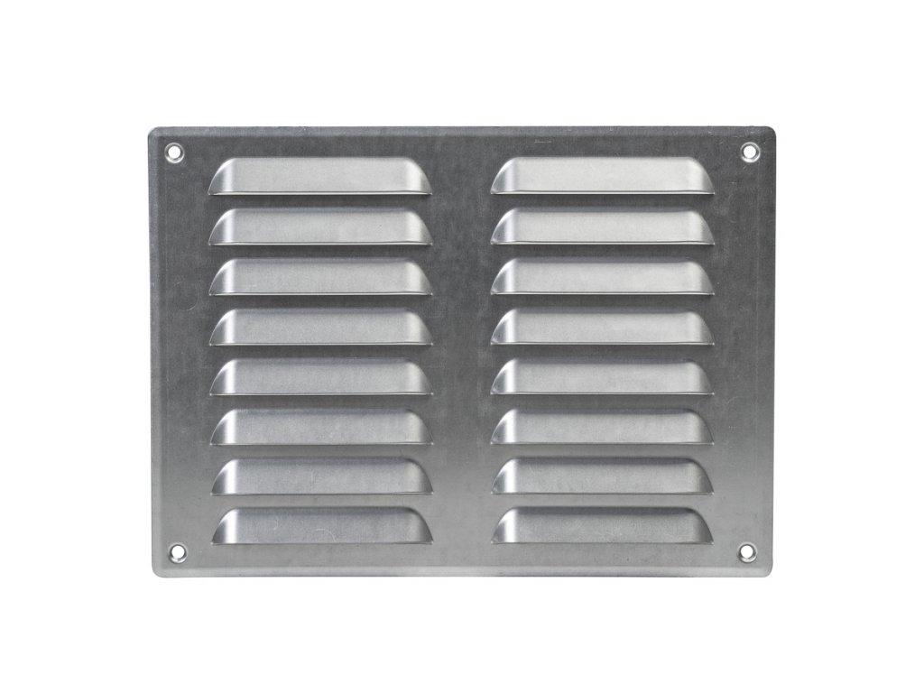 Ventilační mřížka - bez příruby, barva šedá / stříbrná (bez nátěru), materiál pozink. ocel, s pevnou protidešťovou žaluzií, obdélníkový tvar, předpokládané umístění (fasáda, zdivo), elegantní design, síť proti hmyzu, ptactvu, hlodavcům, jednoduchá instalace, montážní otvory, rozměry 260 × 190 mm (Š×V), hmotnost 0,3 kg