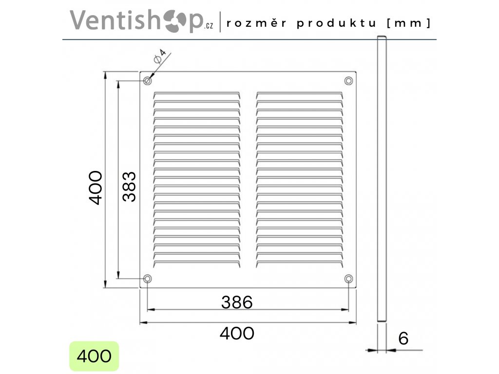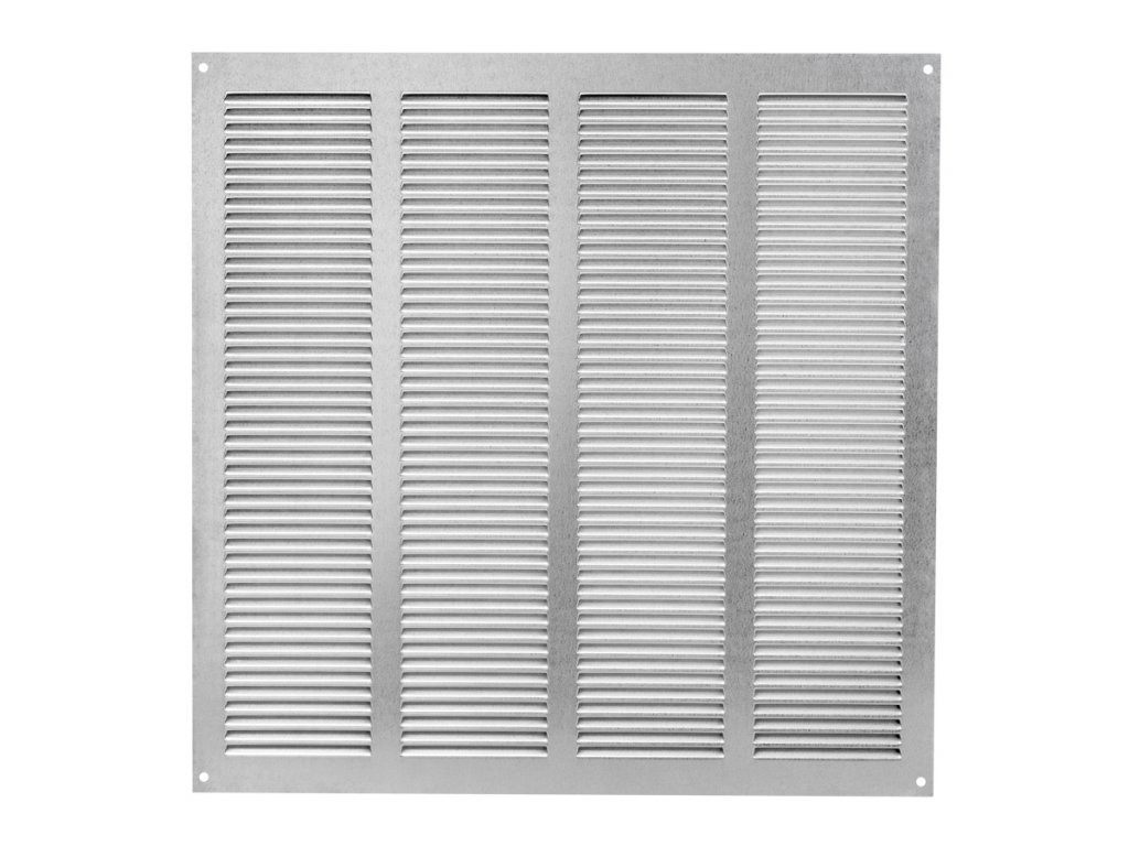 Ventilační mřížka - bez příruby, barva šedá / stříbrná (bez nátěru), materiál pozink. ocel, čtvercový tvar, předpokládané umístění (fasáda, zdivo), elegantní design, síť proti hmyzu, ptactvu, hlodavcům, jednoduchá instalace, montážní otvory, rozměry 400 × 400 mm (Š×V), hmotnost 0,6 kg