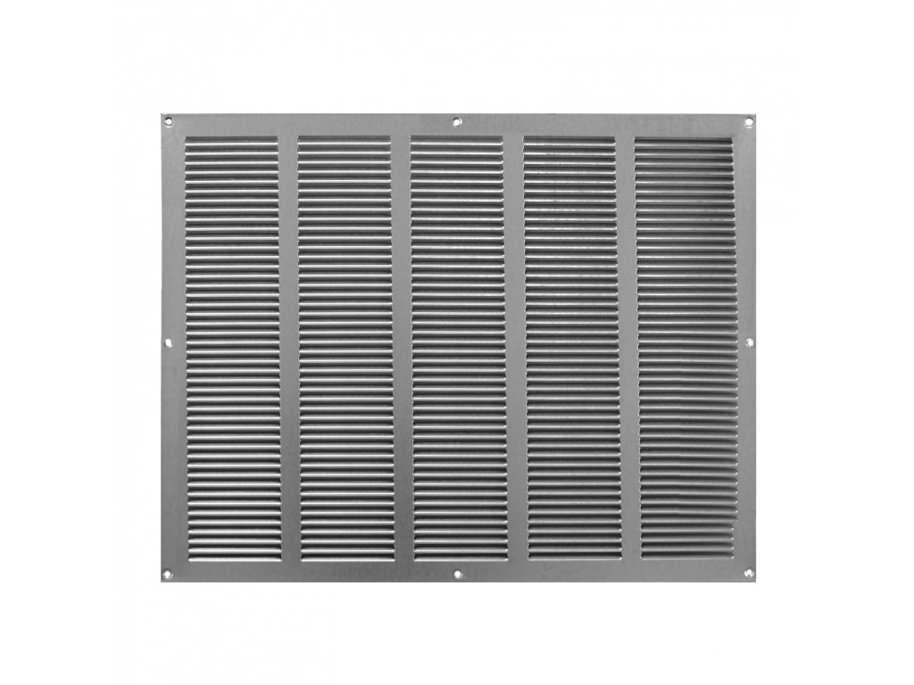 Ventilační mřížka - bez příruby, barva šedá / stříbrná (bez nátěru), materiál pozink. ocel, obdélníkový tvar, předpokládané umístění (fasáda, zdivo), elegantní design, síť proti hmyzu, ptactvu, hlodavcům, jednoduchá instalace, montážní otvory, rozměry 500 × 400 mm (Š×V), hmotnost 0,8 kg