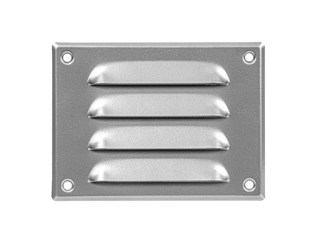 Ventilační mřížka - bez příruby, barva šedá, materiál pozink. ocel, s pevnou protidešťovou žaluzií, obdélníkový tvar, předpokládané umístění (fasáda, zdivo), elegantní design, síť proti hmyzu, ptactvu, hlodavcům, jednoduchá instalace, montážní otvory, rozměry 140 × 105 mm (Š×V), hmotnost 0,1 kg