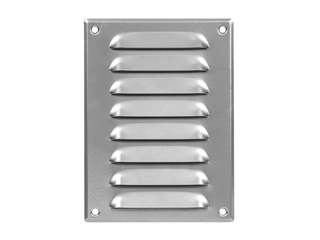 Ventilační mřížka - bez příruby, barva šedá, materiál pozink. ocel, s pevnou protidešťovou žaluzií, obdélníkový tvar, předpokládané umístění (fasáda, zdivo), elegantní design, síť proti hmyzu, ptactvu, hlodavcům, jednoduchá instalace, montážní otvory, rozměry 140 × 190 mm (Š×V), hmotnost 0,2 kg