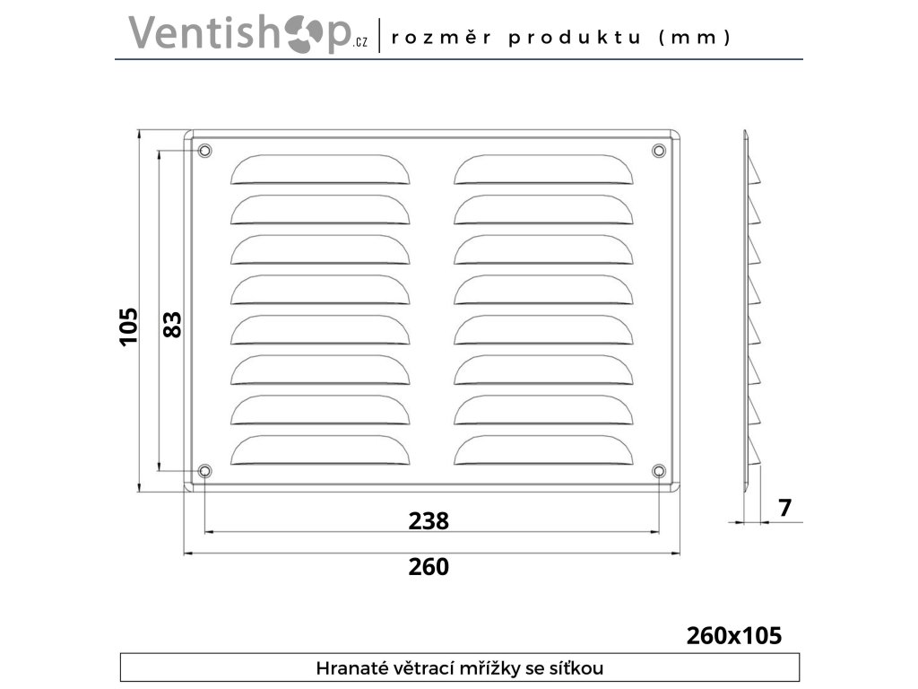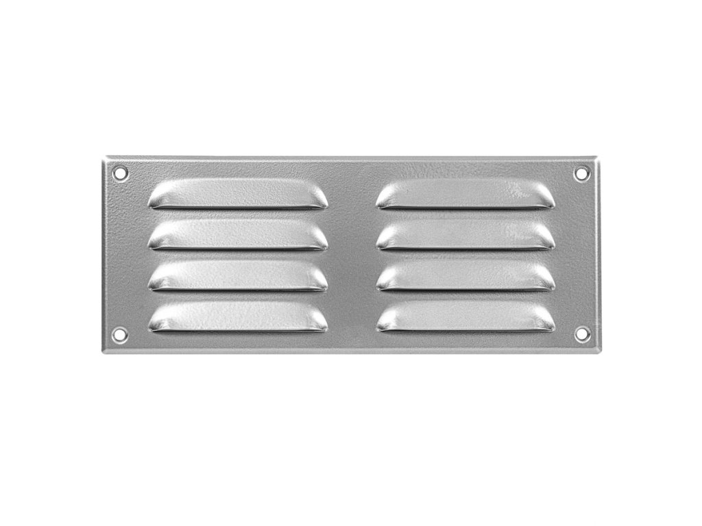 Ventilační mřížka - bez příruby, barva šedá, materiál pozink. ocel, s pevnou protidešťovou žaluzií, obdélníkový tvar, předpokládané umístění (fasáda, zdivo), elegantní design, síť proti hmyzu, ptactvu, hlodavcům, jednoduchá instalace, montážní otvory, rozměry 260 × 105 mm (Š×V), hmotnost 0,2 kg
