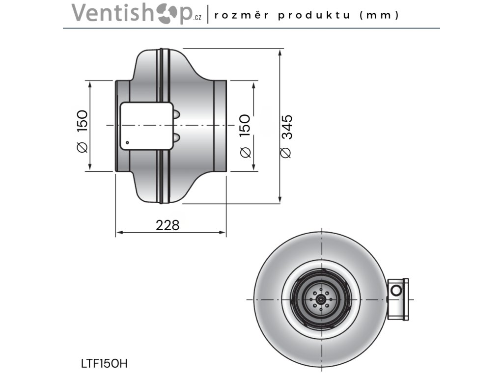 Výkonný potrubní ventilátor - ⌀ 150 mm (průměr potrubí), radiální konstrukce, kuličková ložiska, max. průtok 842 m3/h, příkon 101 W, krytí IP 44, AC motor, plášť z pozink. oceli, provedení se zvýšeným průtokem, lze regulovat (napěťově), hlučnost 49 dB/A, ochrana proti přehřátí, proud 0,44 A, otáčky 2480/min, rozměry 228 × 345 mm (Š×V), hmotnost 4 kg