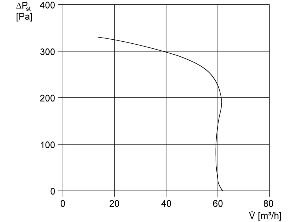 Ventilátor má vynikající technické parametry, které ho předurčují k výbornému odolávání tlakovým změnám. Důkazem je i strmá křivka, na které je vidno, že radiální konstrukce ventilátoru v kombinace s vysokým výkonem hravě odolá změnám tlaku i při delších vzdálenostech potrubí.