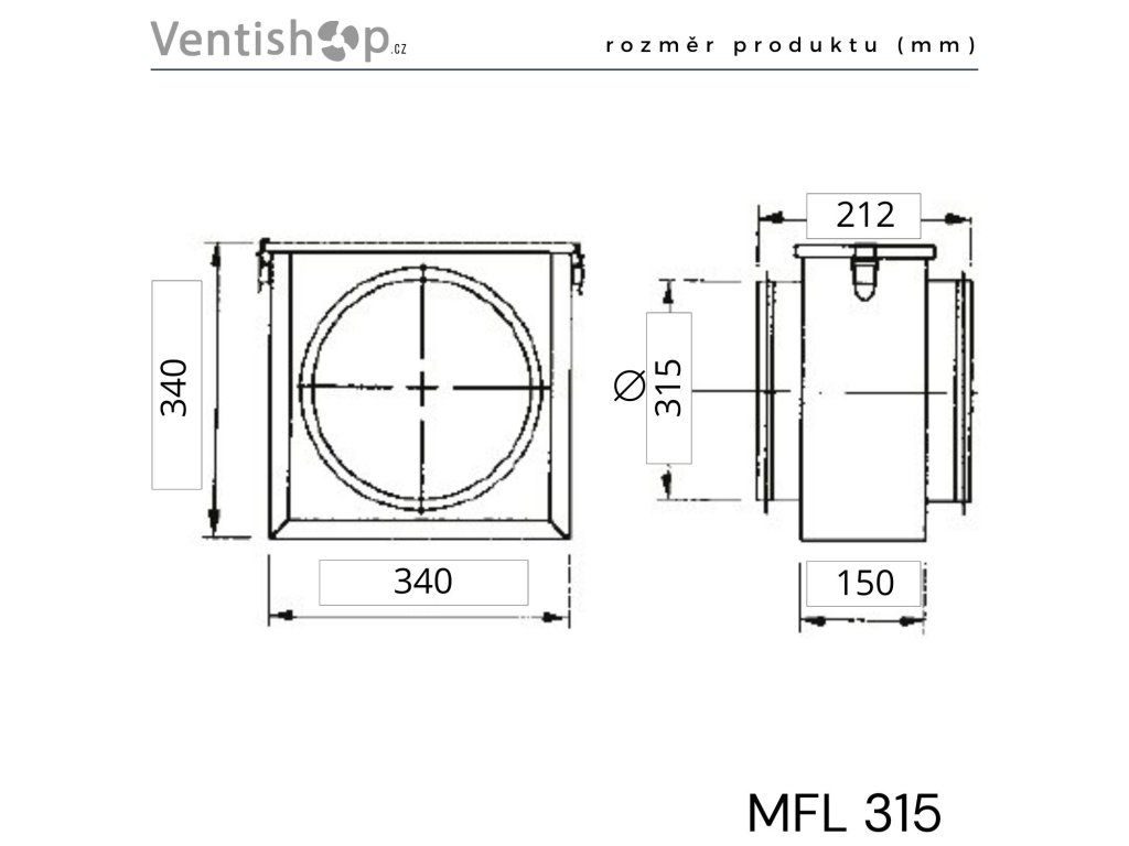 Filtrační kazeta (box) MFL 315 určena pro připojení na kruhové potrubí o průměru 315 mm. Obsahuje filtrační vložku [MFRR] G4 (EU 3). Filtrační kazeta je vyrobena z galvanizované oceli a je opatřena gumovým těsněním pro připojení vzduchotechnického kruhového potrubí. Snadnou výměnu filtrační vložky umožňují zámky na víku kazety.