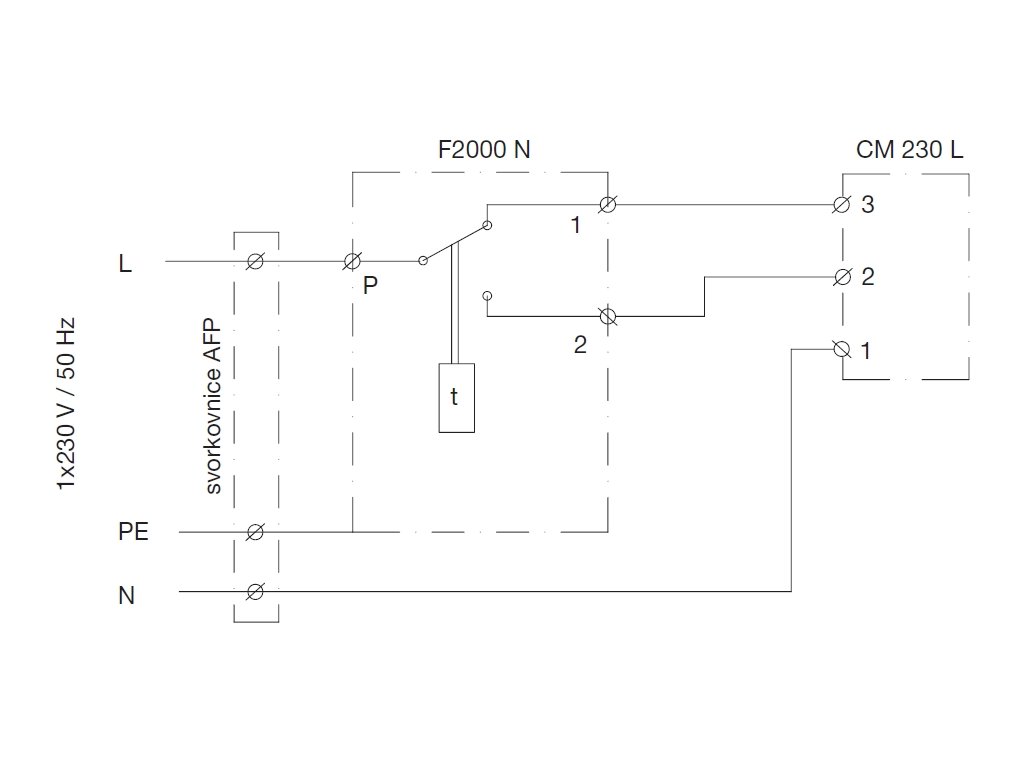 Elektrické připojení dle schématu do „svorkovnice AFP“ umístěné na plášti klapky (svorky L, N, PE). Napájecí napětí 1×230 V / 50 Hz.