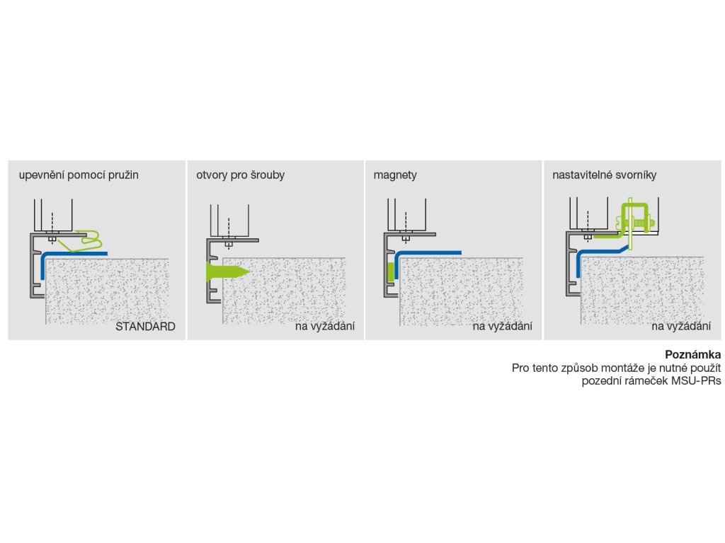 standardně dle montážních pružin. Případně je možné dodat na přání mřížky s předvrtanými otvory pro šrouby, upevnění pomocí magnetů nebo nastavitelných svorníků.