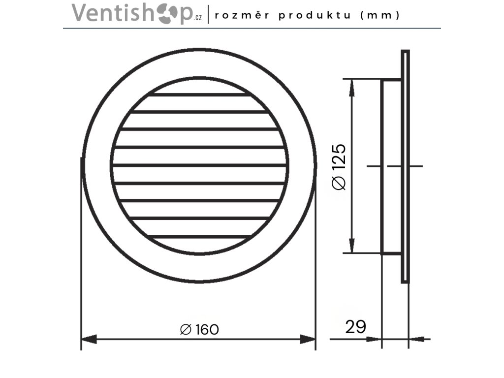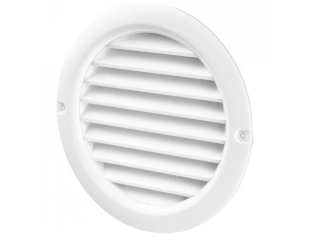 Plastová ventilační mřížka - ⌀ 125 mm (průměr potrubí), materiál ABS plast, síťka proti hmyzu, barva bílá, s perforací pro uchycení vruty, pro nástěnnou i stropní montáž, snadná instalace (vsunutím do potrubí a připevnění např. vruty / lepidlem), kruhová příruba, rozměry 160 × 160 mm (Š×V), hmotnost ~ 0,4 kg