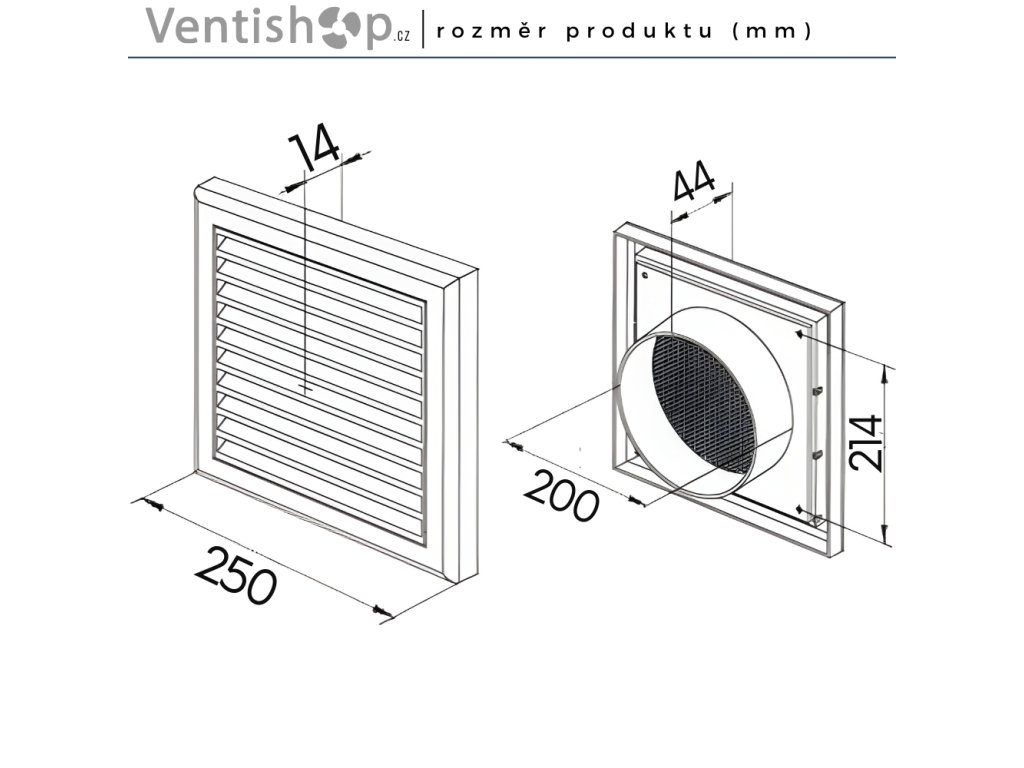 Bílá plastová mřížka se síťkou - pro průměr ⌀ 200 mm, síťka proti hmyzu, s přírubou, pevné manuálně sklopitelné žaluzie, pro vnitřní i vnější montáž, ovládání pomocí páčky / provázku, rozměry konstrukce 250 × 250 mm (Š×V), hmotnost 0,5 kg